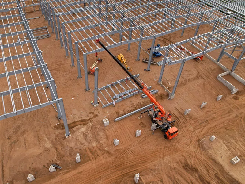 Déi prefabrizéiert Komponenten ginn op de Bauplaz geliwwert an huet mat Kraner an aner schwéier Ausrüstung geliwwert. Den Installatiounsprozess fänkt normalerweis mat der Opbroch an d'Verloschter un der Fundament ze hunn. Beams sinn dann installéiert fir d'Kolonnen ze konnektéieren, bilden de Frame vum Lager. Den Dachverloss goufen ersat a geséchert um Student, ënnerstëtzt den Dachsystem. Dës systematesch Approche garantéiert eng stäerderst a stabil Struktur garantéiert.