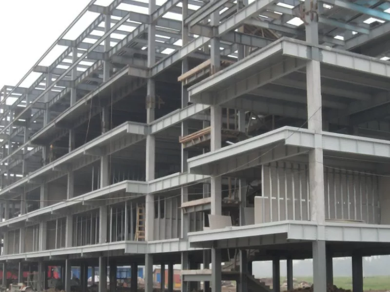 ● Sailen a Balken: De Kader vum Gebai besteet haaptsächlech aus Stahlsäulen a Balken. Dës Komponente sinn entwéckelt fir d'Gewiicht vun der Struktur z'ënnerstëtzen an d'Laascht gläichméisseg ze verdeelen.